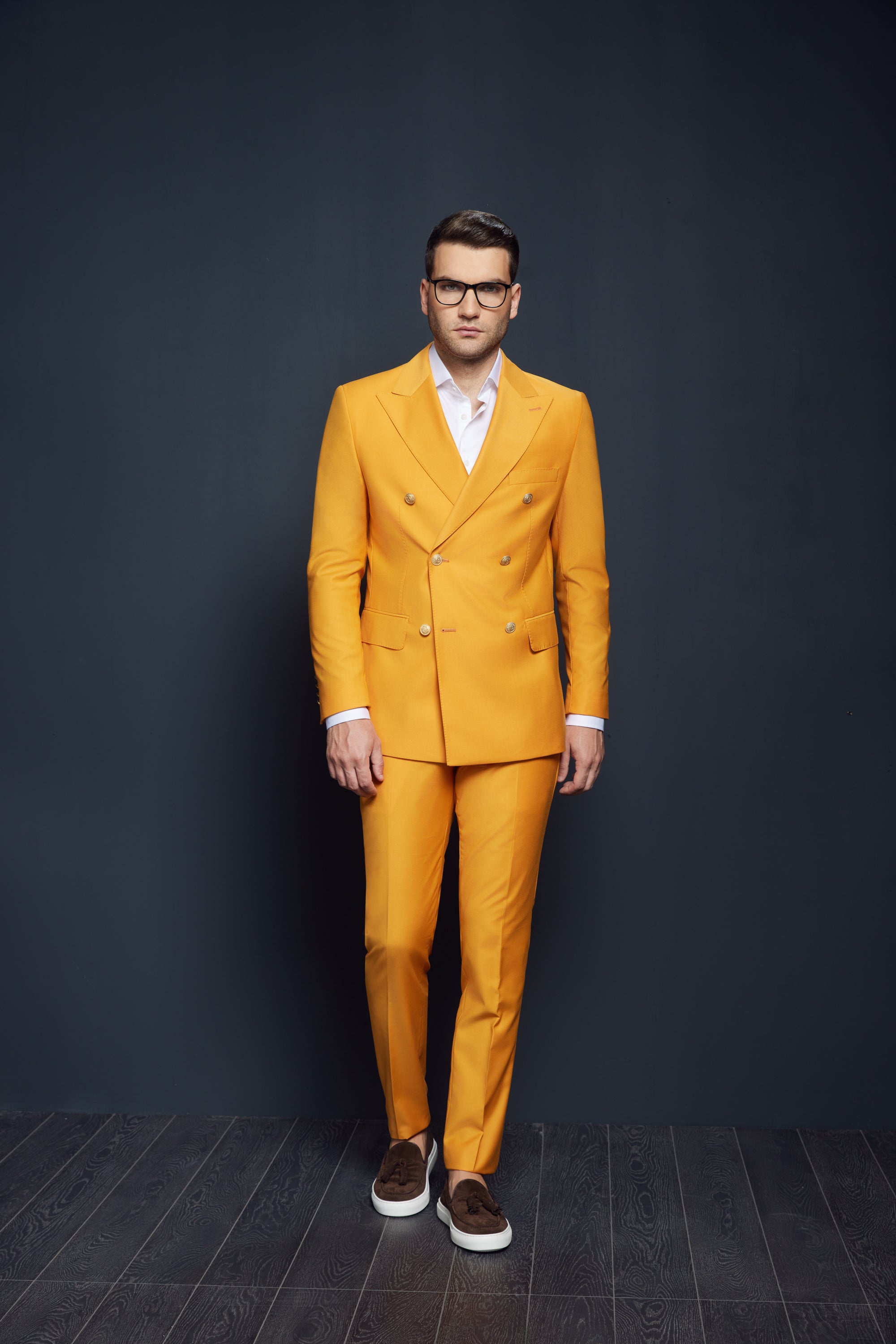 Costumul de bărbați Wyatt în culoare galben închis este o alegere îndrăzneață și distinctivă, perfectă pentru un stil casual rafinat. Cu un rever ascuțit și nasturi aurii, acest costum emană eleganță și sofisticare.
