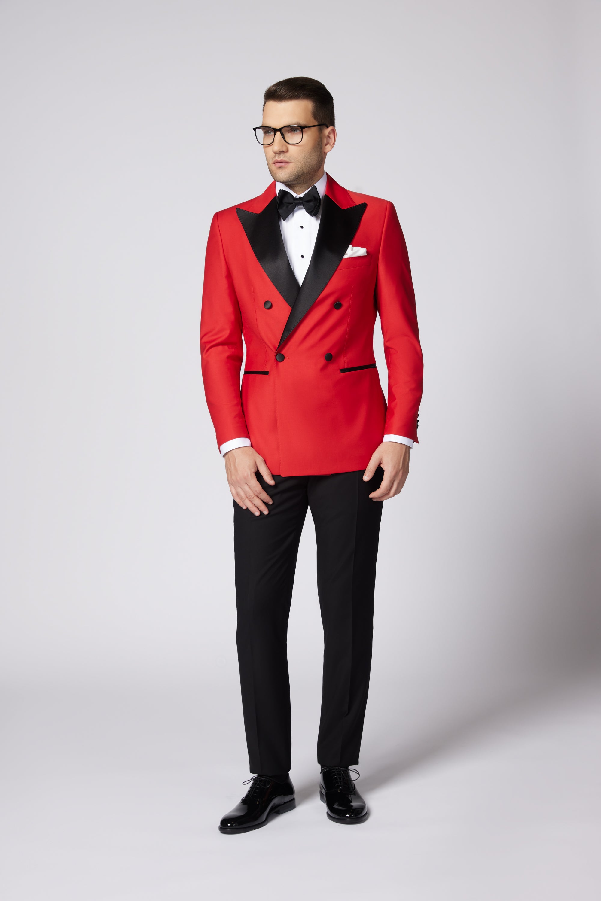 Costumul Nolan în culoare roșie este o alegere îndrăzneață și elegantă pentru o ceremonie specială.