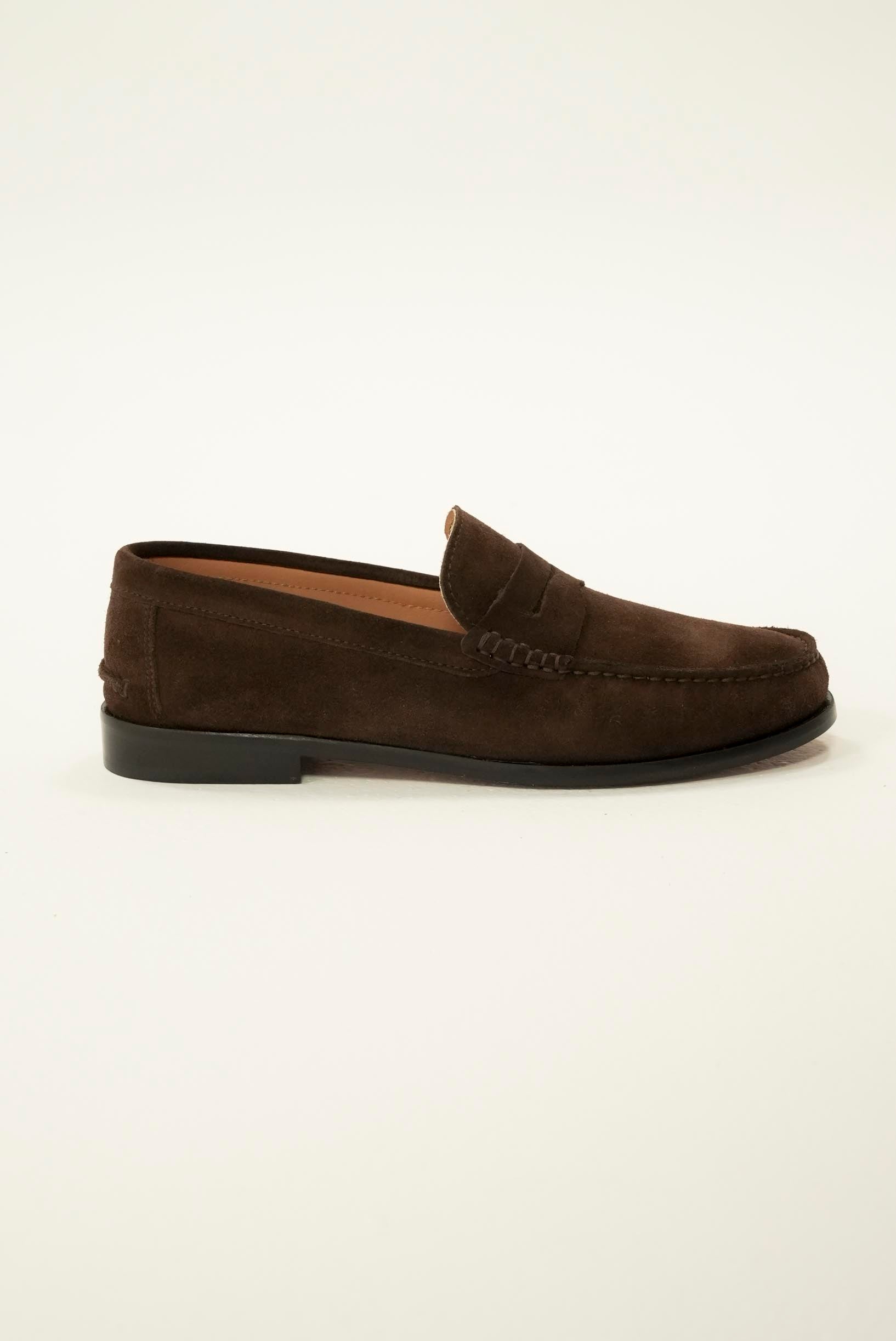 Pentru o ținută casual sau în cadrul unui eveniment de zi sau de seară mai relaxat cum ar fi un garden party, un bărbat modern poate opta pentru o variantă creativă a pantofilor casual și anume acești penny loafers maro piele întoarsă de vițel cu talpă joasă, stil mocasin.